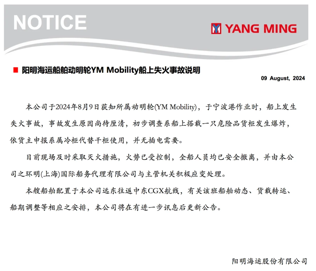据悉,“动明”轮(YM Mobility)为阳明海运旗下船舶。阳明海运今日晚间就此事发布官方声明。