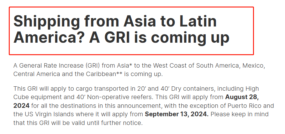 近日,赫伯罗特在其官网发布公告,宣布自2024年8月28日起,将上调从亚洲运往南美洲西海岸、墨西哥、中美洲及加勒比海地区货物的GRI费率,有效期直至另行通知。
